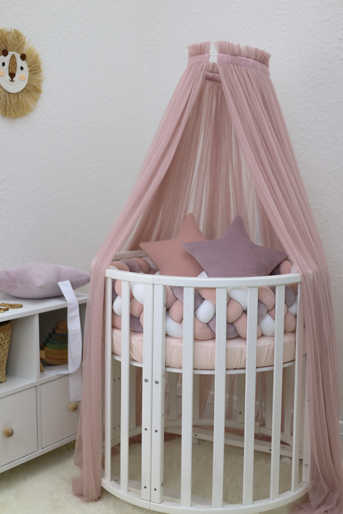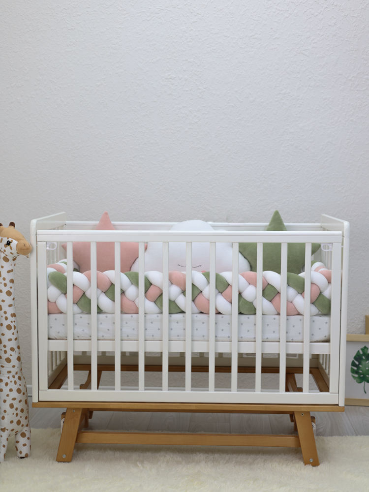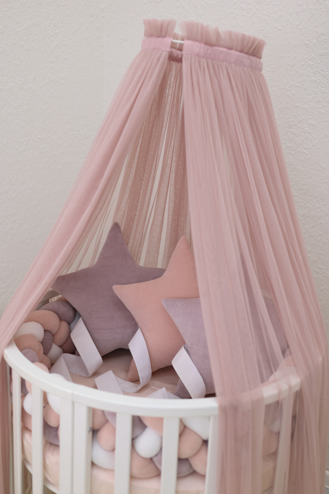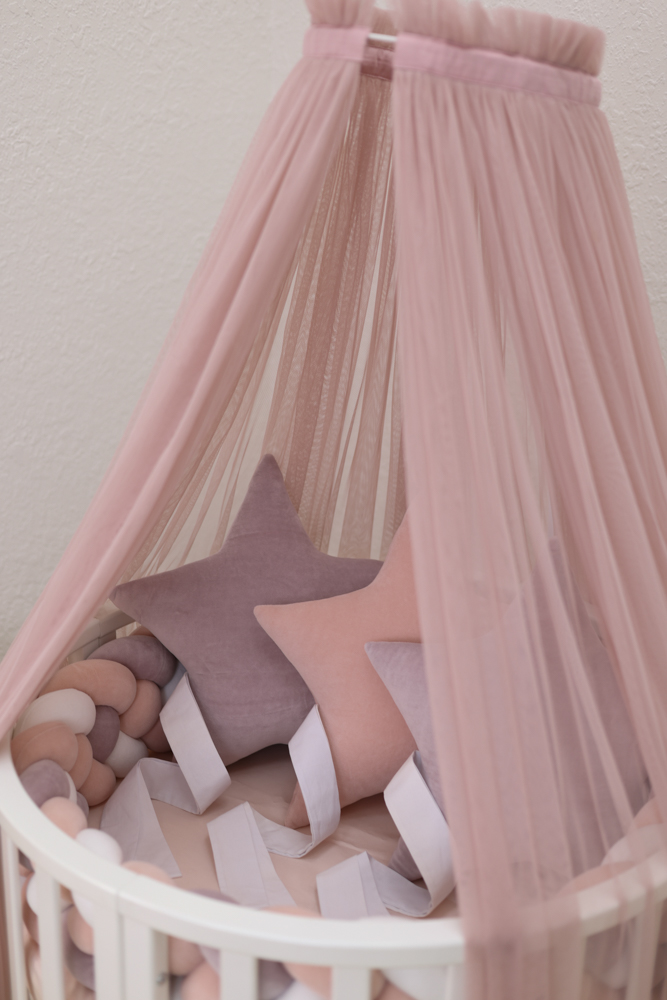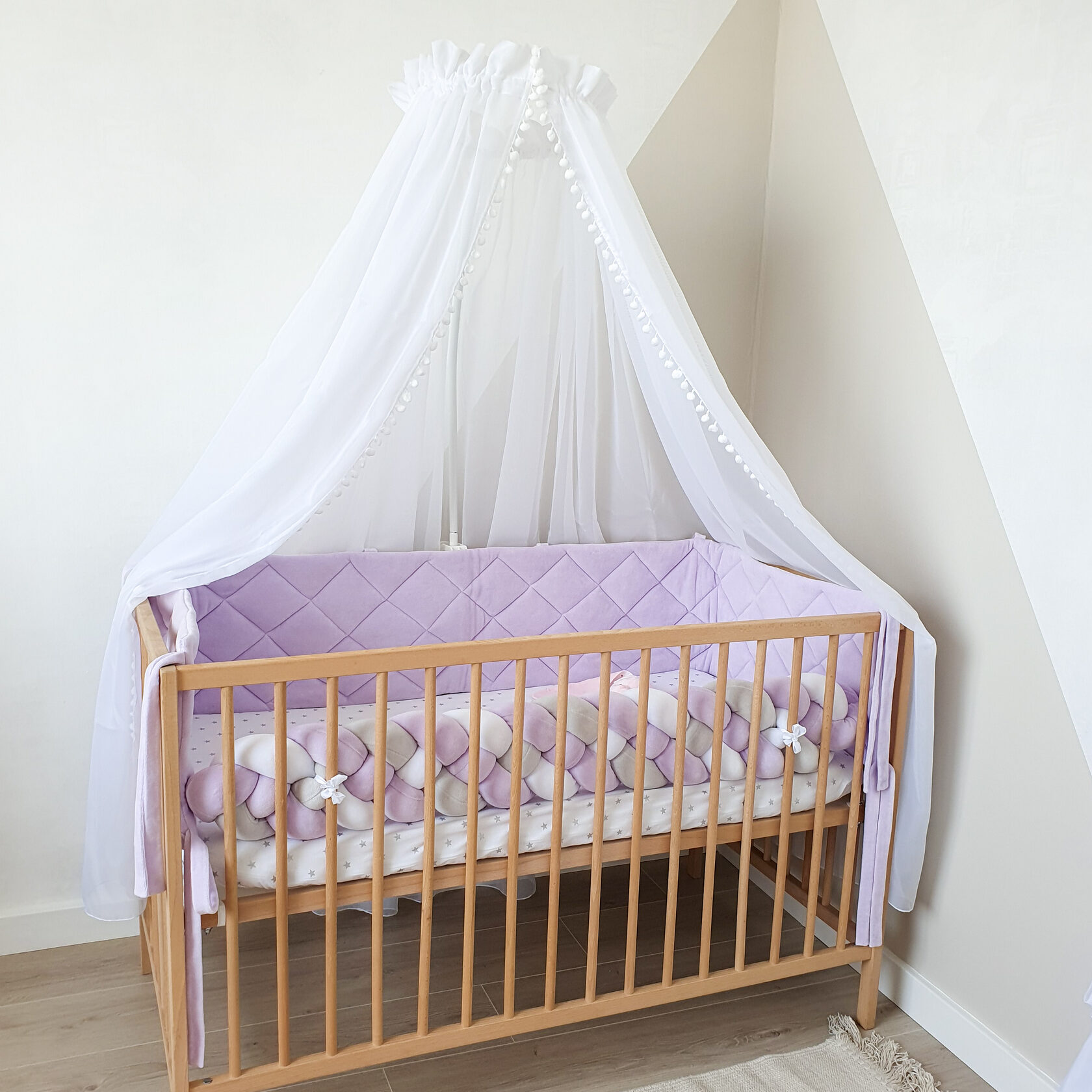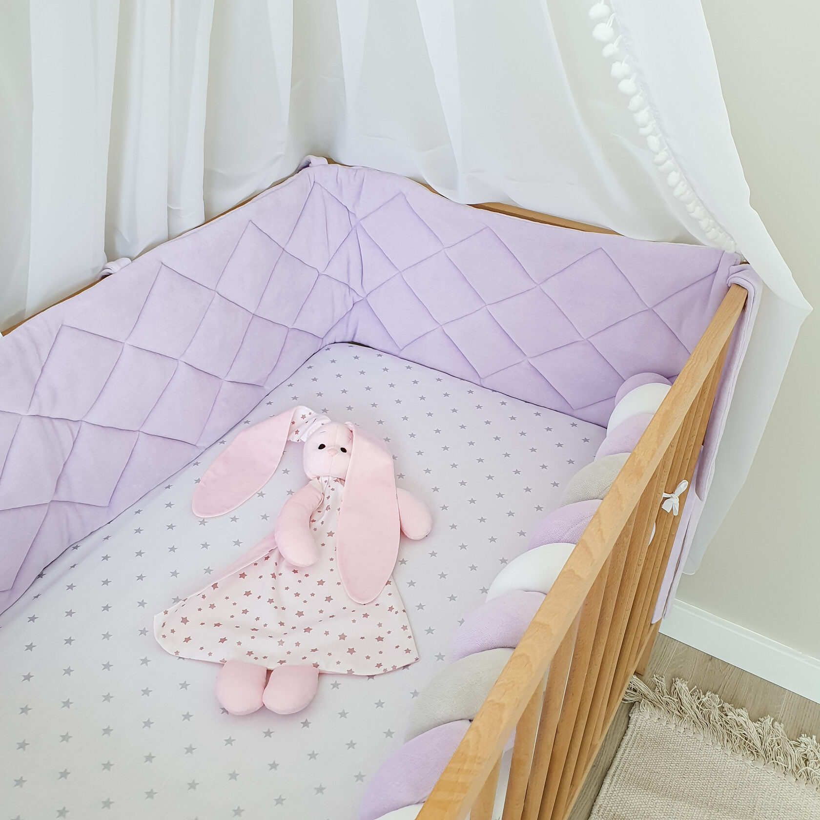 Нежнейшие плоские бортики в оттенке "Нежная сирень" высотой 30 см и длиной 235 см, что идеально подойдет на весь периметр круглой кроватки, диаметром 75 см или на три стороны прямоугольной кроватки 120х60 см или на три стороны овальной кроватки.